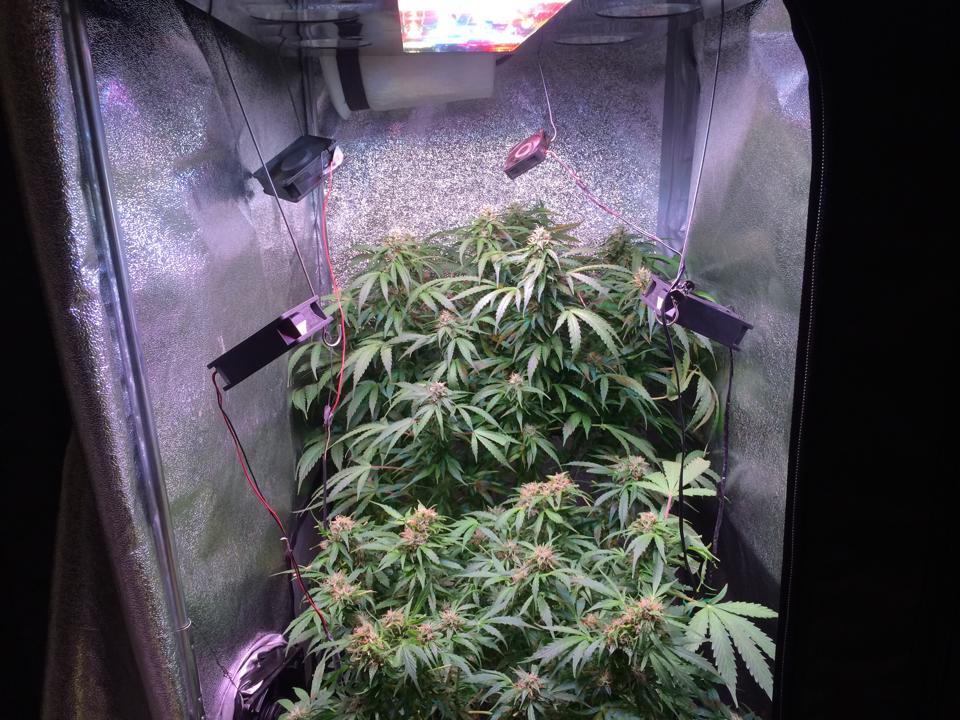 Om de schade verder te beperken heb ik de twee aangetaste toppen uit de voorste plant rigoureus afgeknipt en ook het een en ander aan schutbladeren uit de planten geknipt. Zo wordt het bladerdek weer open en kan er meer lucht doorheen waardoor vocht sneller afgevoerd wordt. Daarnaast heb ik 4 extra PC ventilators in mijn tent opgehangen. Ik hoop nu dat de budrot net als de trips daarmee wegblijft zodat mijn planten rustig kunnen afbloeien. Ik heb wel even genoeg van die narigheid en mijn toppen kunnen nog best wat groter groeien.