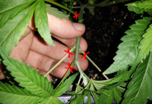 Iets later dan gepland is dit het derde verslag van de kweek waarin ik de OG Double Bubble zal schwazzen. Schwazzen is een techniek waarbij het selectief weghalen van blad voor een betere licht- en luchtpenetratie zorgt, waardoor ook de opbrengst wordt vergroot. Mijn wietplanten zijn ondertussen zo’n 4 tot 5 weken oud, verpot naar hun grote eindpotten, en getopt. Ook heb ik enkele van de onderste schutbladeren weggehaald om zo de groei van de zijtakken extra te stimuleren.
