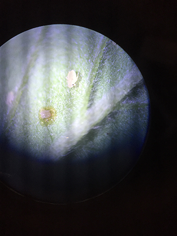 27 juli: de blaadjes controleren op beestjes; je hebt goede maar ook slechte insecten en dat moet je in degaten houden. Nog nooit heb ik hiermee last gehad, tot nu toe. Bladluizen, de eerste Hollands Hope zat er helemaal vol mee, die heb ik dan maar naar buiten gegooid. De rest van de planten heb ik ’s avonds laat besproeid met water en een druppel vloerzeep. Twee uur lang heb ik zitten benevelen…