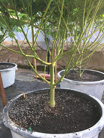 1 augustus: de topjes komen tevoorschijn en de avonden worden korter, begin van de bloeifase. Ik twijfel nog altijd waneer ze precies in bloei gaan, elke keer is het toch iets anders. Maar zo leer je iedere keer meer en meer. Bijna alle takjes en blaadjes onder het rek zijn verwijderd. Als je niet teveel in één keer weghaalt, dan voelen de dames dit bijna niet.