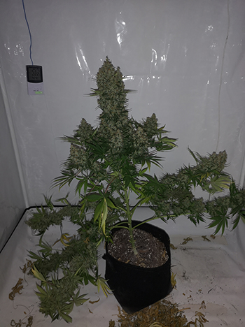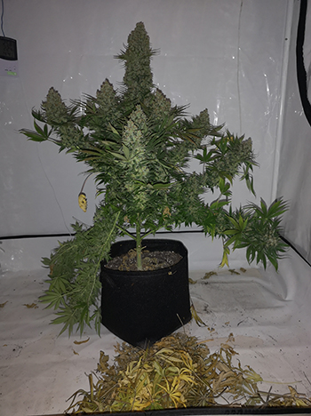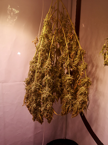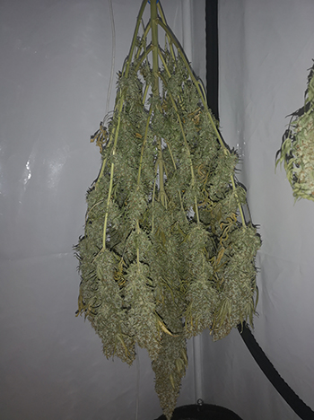 Ik neem iedere plant uit de tent en haal eerst alle grote schutbladeren en alle kleinere bladeren zonder kristallen eraf. Dan snij ik de hele plant beneden aan de stam af, en hang deze ondersteboven in mijn lege tent. Ik droog in dezelfde kweektent waarin ik de planten ook kweek, en dus haal ik eerst de lampen weg en hang ik er een paar waslijntjes op. Daaraan kan ik dan makkelijk met een draadje de planten hangen zodat ze elkaar niet aanraken en goed kunnen drogen.