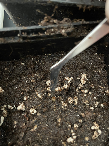 Met een pincet leg ik steeds een zaadje aan de zijkant van het gemaakte gaatje, met de witte wortel naar beneden gericht, en de zaadjes zelf precies op de rand van het kuiltje. Dan druk ik de aarde van de andere kant van het kuiltje voorzichtig naar het zaadje toe. Zodat de wortel goed omsloten is met aarde en alleen nog de bovenkant van het zaadje te zien is.