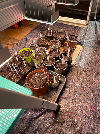 Ik vul de kleine potjes eerst met lightmix aarde en giet voorzichtig wat water in iedere pot zodat de aarde goed vochtig is, maar niet nat. Dan maak ik met mijn pink (met handschoenen aan!) een gaatje in de aarde in het midden van ieder potje.