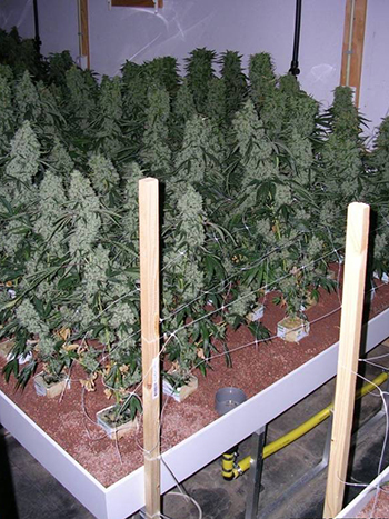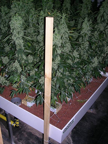Omdat de planten niet voorgroeien maar meteen op 12/12 gezet worden, zullen ze uiteraard minder groot worden. Ze krijgen ook geen noemenswaardige zijtakken maar dus wel één mooie dikke top per plant. Hoeveel planten je op dit systeem moet zetten? Op een vierkante meter bijvoorbeeld een stuk of 36. Zolang je er maar voor zorgt dat de gehele oppervlakte goed belicht wordt. Omdat het bladerdek in een dergelijk systeem bijna vanzelf gelijkmatig opgroeit, kun je de kweeklamp makkelijk op de ideale hoogte boven de planten hangen.