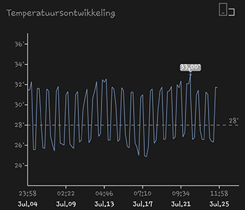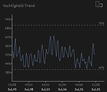 De klimaatgrafieken uit de G-Kit XL zijn deze keer over een wat grotere periode dan van één week. Deze week bekijken we de cijfers van de afgelopen drie weken. De 315 Watt CMH binnenzon hing de afgelopen periode 25 centimeter boven de dames. De gemiddelde temperatuur van afgelopen drie weken was 28,27 graden Celsius. De temperatuur is over deze tijd redelijk stabiel gebleven. De gemiddelde luchtvochtigheid over dezelfde periode was 53,69 procent. De laatste stijging lijkt veroorzaakt te zijn door het drogen van het beddengoed. Ik had de kamerdeur open laten staan. De bewatering van de dames gebeurt nog steeds dagelijks en dan krijgen ze 850 milliliter water met voeding van Plagron.