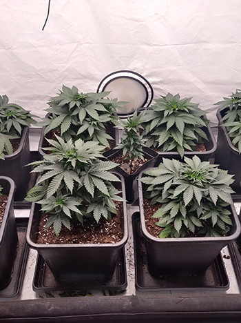 De negende plant in de ruimte (die kleine die steeds in het midden staat) is een testplant, en komt mooi mee met de rest. Ze laat wel duidelijk zien dat een grotere pot ook daadwerkelijk zorgt voor een grotere plant. Want waar de planten in de 18-literpotten een goede 35-40 centimeter hoog zijn, blijft de kleine een beetje achter met een kleine 20 centimeter. Ook ontwikkelen de bladeren van deze plant zich minder goed. We hebben het plantje twee keer getopt, en halen alles behalve de hoofdtoppen weg, om te kijken hoe de plant hierop reageert en zich ontwikkelt. Ook deze kleinere Snow White zal gewoon meedoen in de SCROG, en wel in het midden van de tent waar zij op voorgaande foto’s ook te zien is.
