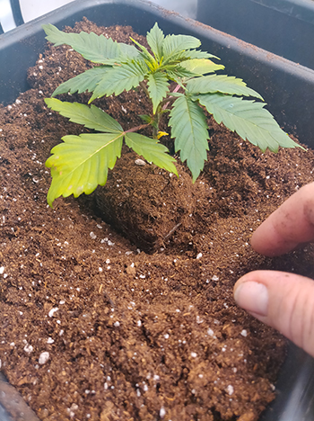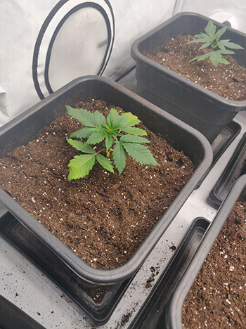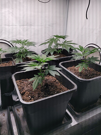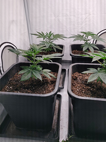De planten staan in acht 18-literpoten waar we afgelopen week de dames in hebben verpot. Het was de hoogste tijd daarvoor want de wortels raakten al een klein beetje bekneld in de kleine potjes. Gelukkig hebben ze nu ruimte genoeg om lekker te wortelen. Om daarbij te helpen hebben wij onze kleine 5 Watt clip-on ventilator vervangen voor een 20 Watt oscillerende ProFAN van Garden Highpro.