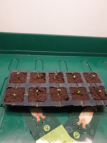 We beginnen deze kweek zoals altijd met het ontkiemen van de zaden volgens onze vaste routine. Om een goed resultaat te behalen laten we de zaden eerst 24 uur op kamer temperatuur acclimatiseren. Daarna schuren we de zaden heel lichtjes en gaan ze in een borrelglaasje met lauw water, voor 24 uur op een donkere plek. Na deze 24 uur zijn twee van de zaden al uitgekomen. We leggen ze samen met de anderen op natte wattenpads terug op een donkere plek tot ze allemaal ontkiemd zijn.