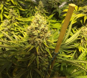 Ik doe dat persoonlijk de laatste 14 dagen voor de oogst, maar 7 tot 10 dagen zou ook voldoende moeten zijn. Door het geven van alleen maar water, gaat de plant alle voedingsstoffen, die nog in de aarde zit opgebruiken. De plant zal ook gele bladeren krijgen, dat begint bij de grote bladeren en gaat dan door met de kleine… en dat is goed zo! Dat is een teken dat de plant haar eigen voeding gebruikt om door te gaan met bloeien.