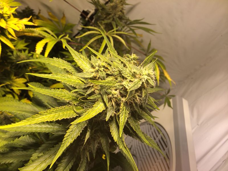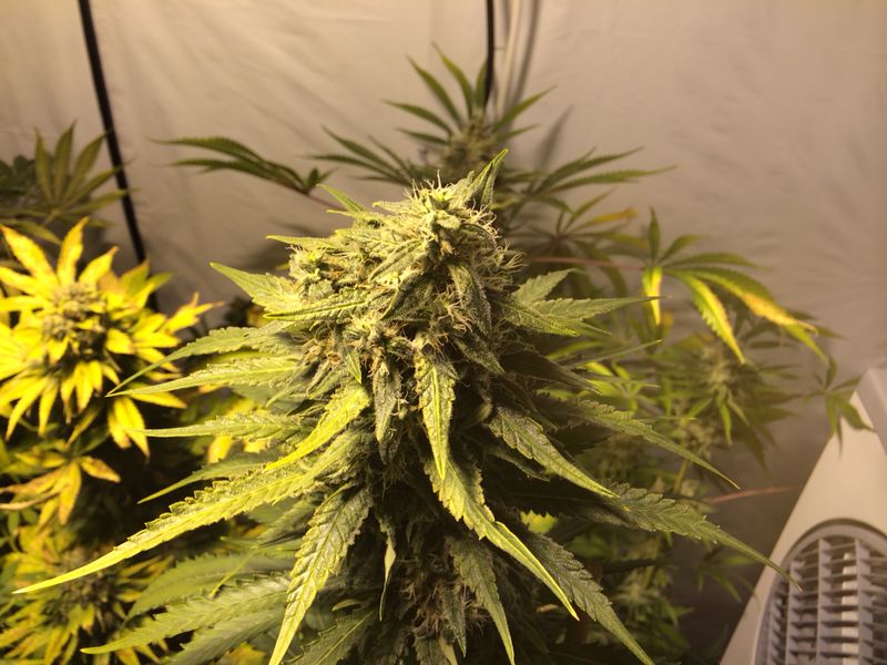 Mijn plantjes zijn thuis voorspoedig doorgegaan met bloeien, en de toppen worden vetter en vetter en barsten werkelijk van de kristallen. Ik was bij mijn terugkomst echt verbaasd om te zien hoe ver de dames nu al zijn! De oogst nadert nu, na 59 dagen in de bloei en sinds dag nummer 52 geef ik daarom alleen maar water, een geen druppel voeding meer.