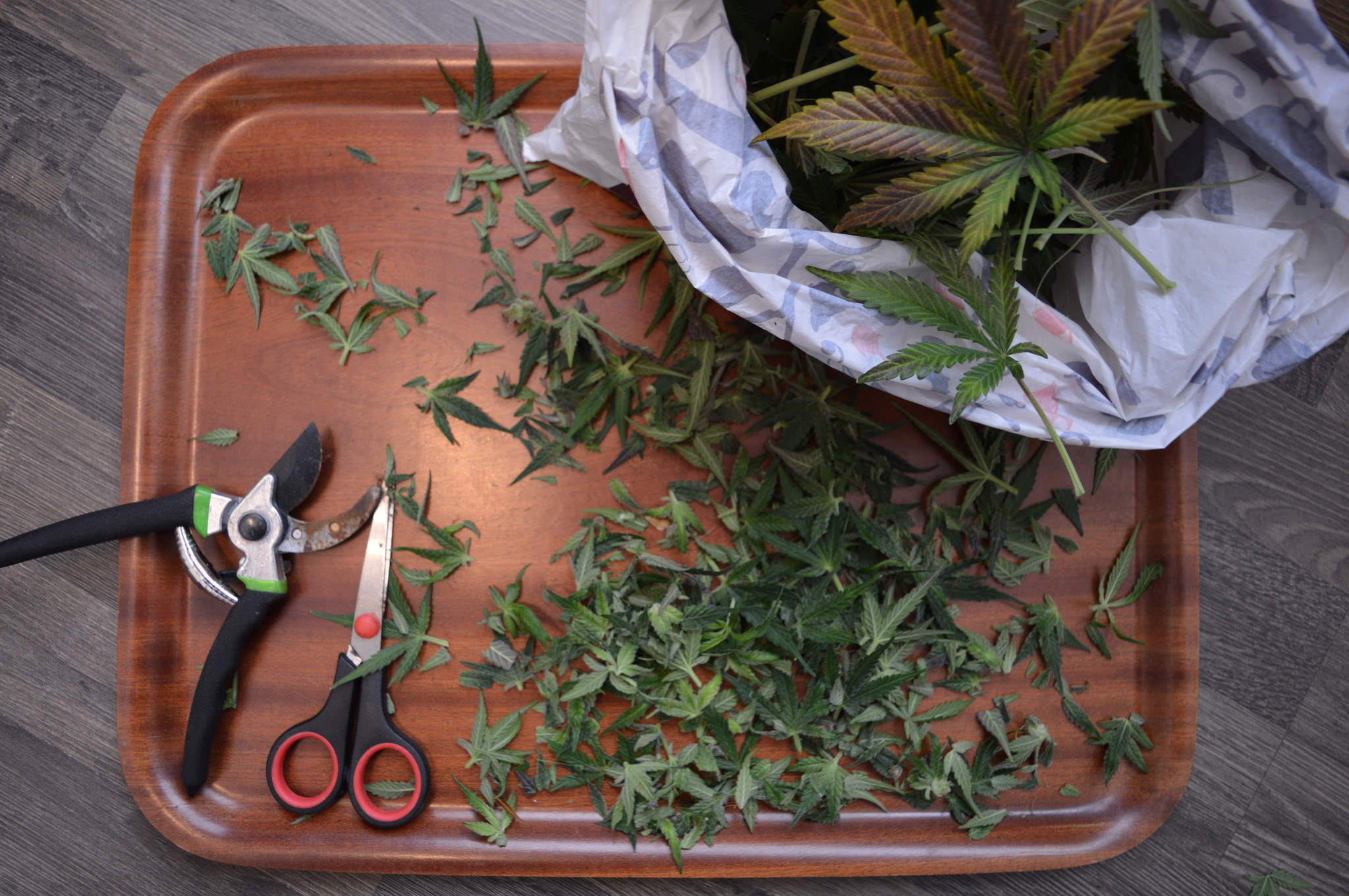 Nu komt het bewerkelijkste klusje en dat is het verwijderen van de suikerblaadjes. Hoe preciezer je te werk gaat, hoe mooier de wiet er straks na het drogen uit zal zien. Het is verleidelijk om het principe, grote stappen snel thuis, te hanteren, maar dit is niet de bedoeling. Zet dus maar een lekker muziekje op en neem je tijd om alle uitstekende suikerblaadjes een voor een weg te knippen. Werk van onder naar boven en gebruik zoveel mogelijk het puntje van je schaar. Probeer de blaadjes zo dicht mogelijk bij de stam of de top af te knippen en bewaar het leukste voor het laatst: de hoofdtop.