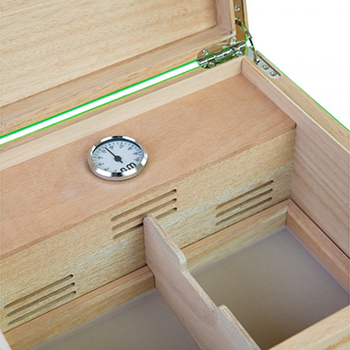 Wanneer de Fum box humidor dicht is, is hij hermetisch afgesloten voor lucht van buitenaf. Van binnen zorgt het vochtcirculatiesysteem ervoor dat de luchtvochtigheid in de box optimaal blijft. De box is zoals gezegd gemaakt van Okoumé hout, een vochtbestendige houtsoort die geen geur of smaak afgeeft. Twee inbegrepen sponzen zorgen ervoor dat de lucht niet te droog wordt, terwijl je de exacte luchtvochtigheid kunt aflezen op de ingebouwde analoge hygrometer.
