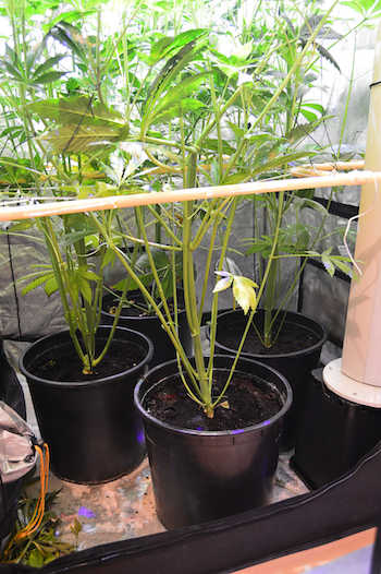 Laat ik beginnen met het verslaan van week vijf van de bloei van de drie Moon Walker Kush planten in de tent. Daar gaat het super, al heb ik wel het idee dat de dames het strekken een beetje overdrijven. Het lijkt wel een bos met twintig vingers die de Budmaster proberen te pakken. De planten strekken nu nog steeds, ondanks dat we inmiddels al in de vijfde bloeiweek zitten. Ik heb gisteren nog een paar takken omgebogen, dat kun je ook zien op de foto’s.