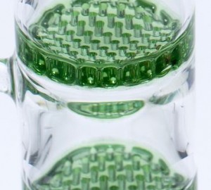 Deze bongs met dubbele percolators zijn nieuwe instapmodellen van GG Bongs maar daarmee niet minder goed als de duurdere exemplaren. Want zoals alle Grace Glass bongs zijn ze gemaakt van gehard 4 millimeter dik en hittebestendig borosilicaatglas en kunnen dus wel tegen een stootje. De twee percolators zorgen voor zijdezachte hits die nog verder gekoeld kunnen worden door de bong met een paar ijsblokjes te vullen. De speciale vorm zorgt ervoor dat de ijsblokjes in de bovenste helft van de bong blijven en niet op de percolators kunnen vallen.