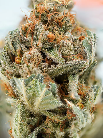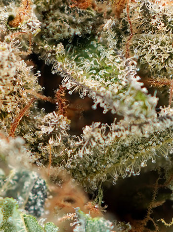 Als we op de wiet inzoomen zien we een landschap vol gezonde trichomen, waarvan naar schatting 5 tot 10 procent amberkleurig zijn. Een groter aantal amberkleurige trichomen betekent doorgaans een hoger CBN gehalte, en een meer indica couch lock effect. Maar aangezien dit een sativa dominante soort is en de kweker ook graag een upliftende sativa-high effect zoekt, is deze wiet op het juiste moment geoogst.