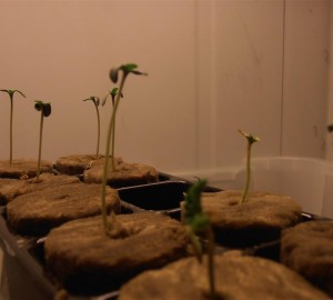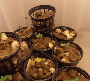 Anyway, het ontkiemen in de Speedgrow pluggen verliep zonder enige moeite en slechts 36 uurtjes later stonden de meeste boven. Onder een 2×55 watt duo-fluor lamp gedurende de eesrte 5 dagen 24 uurtjes. En ze gingen al een trein. Alles natuurlijk in de bijhorende netpotjes gedaan. Wel gevuld met het bekende RFX-1 substraat. Een paar dagen wateren van bovenaf omdat ze nog in een bak stonden he….