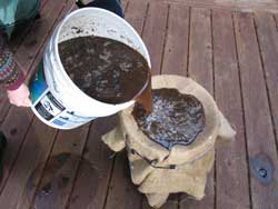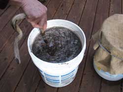 Ruik even aan het mengsel om te checken of het klaar is. Als het verrot ruikt dan kun je eventueel nog wat melasse toevoegen en het mengsel nog een dag laten staan, maar het zou echter nooit langer dan drie of vier dagen moeten duren. Wanneer het mengsel neutraal ruikt en niet stinkt maar wel een schimmel-achtige geur heeft, is het klaar om te filteren. Giet het door een oud laken of kaasdoek over in een andere emmer en gebruik het meteen. Je kunt deze compost-thee namelijk niet erg lang bewaren omdat de micro-organismen uit de melasse het anders niet overleven. Kun je het niet meteen gebruiken, dan kun je eventueel nog wat melasse toevoegen en de pomp weer aanzetten om het langer goed te houden, maar langer dan een paar dagen kun je de houdbaarheid helaas niet rekken.