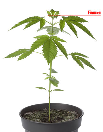 Fimmen lijkt heel veel op toppen, en heeft een vergelijkbaar resultaat. Maar omdat je bij het fimmen niet de hele top verwijdert, zorgt het fimmen voor iets minder stress bij de plant. Verder laat je bij het fimmen de beginselen van twee nieuwe zijtakken in de plant zitten. Hierdoor krijgt de plant niet twee, maar vier nieuwe hoofdtoppen.