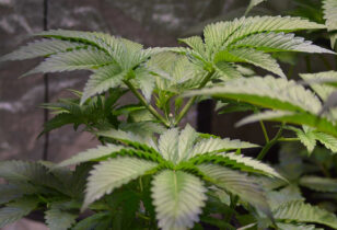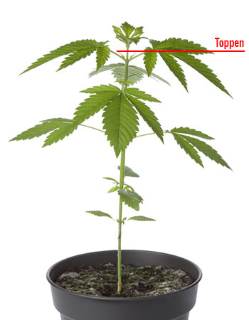 Een pas gefimde wietplant. De twee scheuten onder het topje, en de twee scheuten in topje zullen uitgroeien tot vier nieuwe hoofdtoppen.