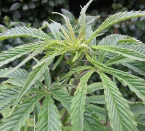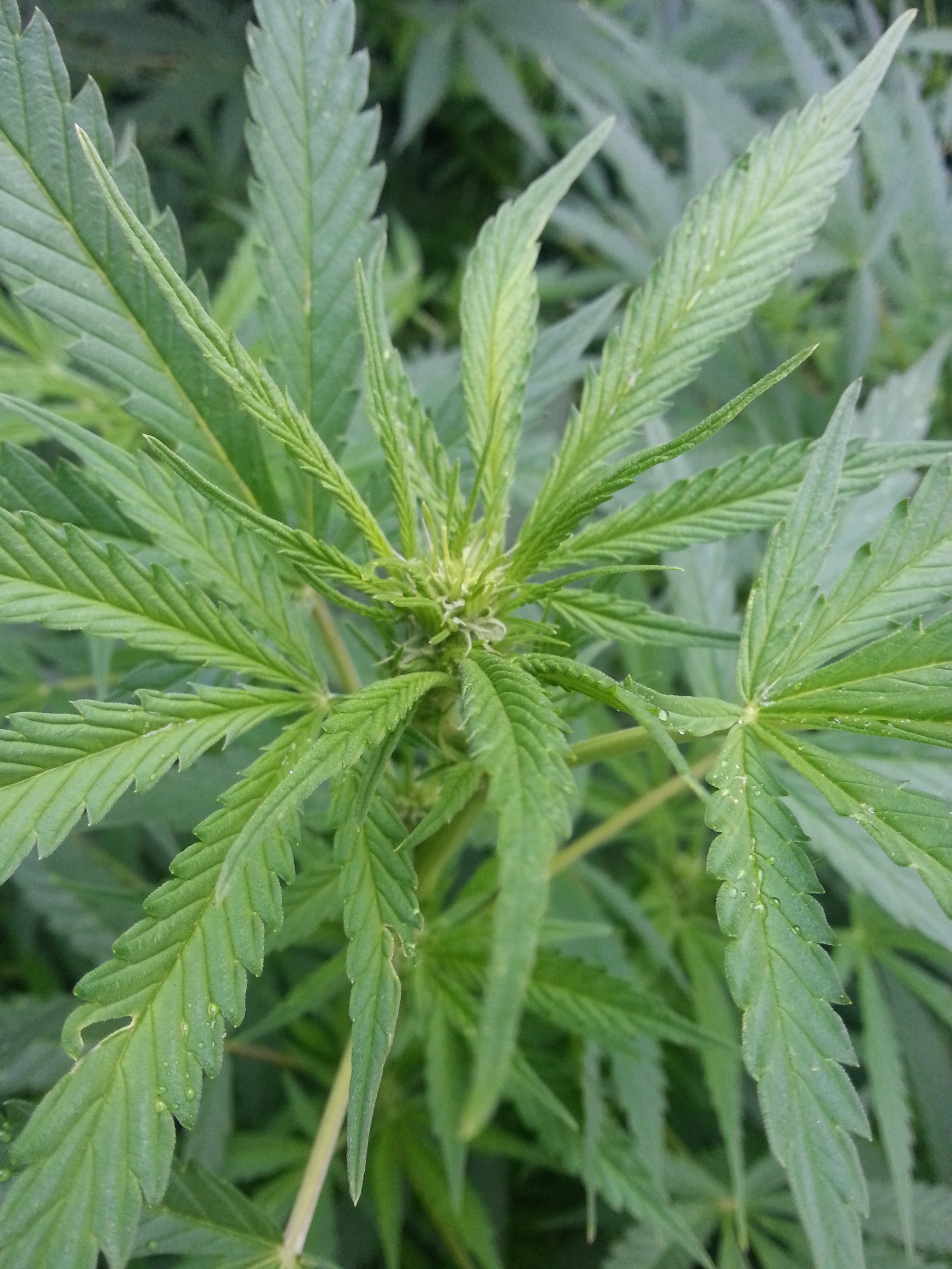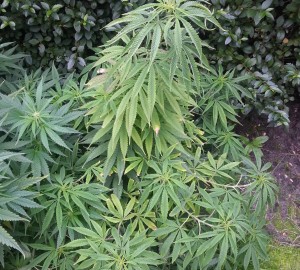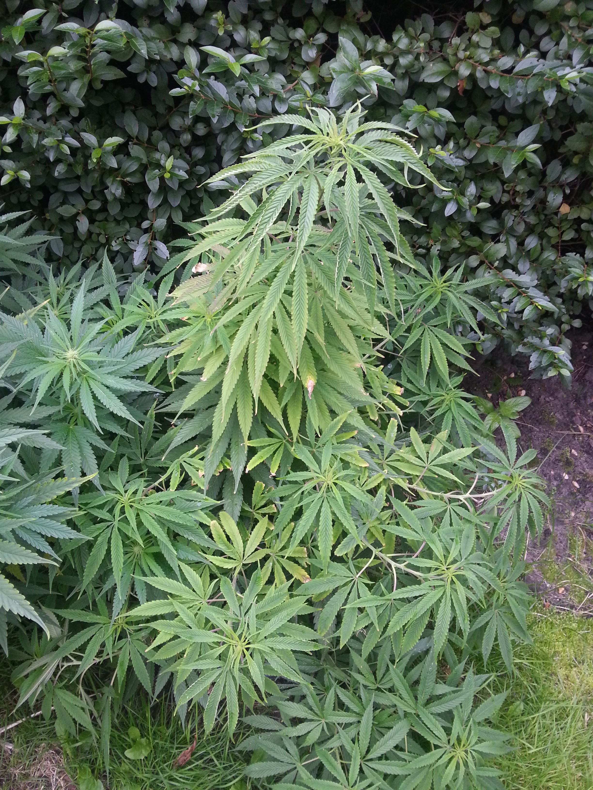 De twee wietplanten die bij mij de hele zomer in de volle grond hebben gestaan zijn met verre voorsprong de mooiste wietplanten die ik deze zomer buiten heb gekweekt. De hele cyclus lang was er geen vlekje of verkleuring bij ze te zien, en dat betekent dat ze geen tekorten of overschotten hebben meegemaakt. Ze hebben een enorme ontwikkeling doorgemaakt is slechts een paar maanden tijd. Om dat te laten zien heb ik er even een foto van mei bij gepakt.