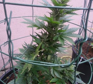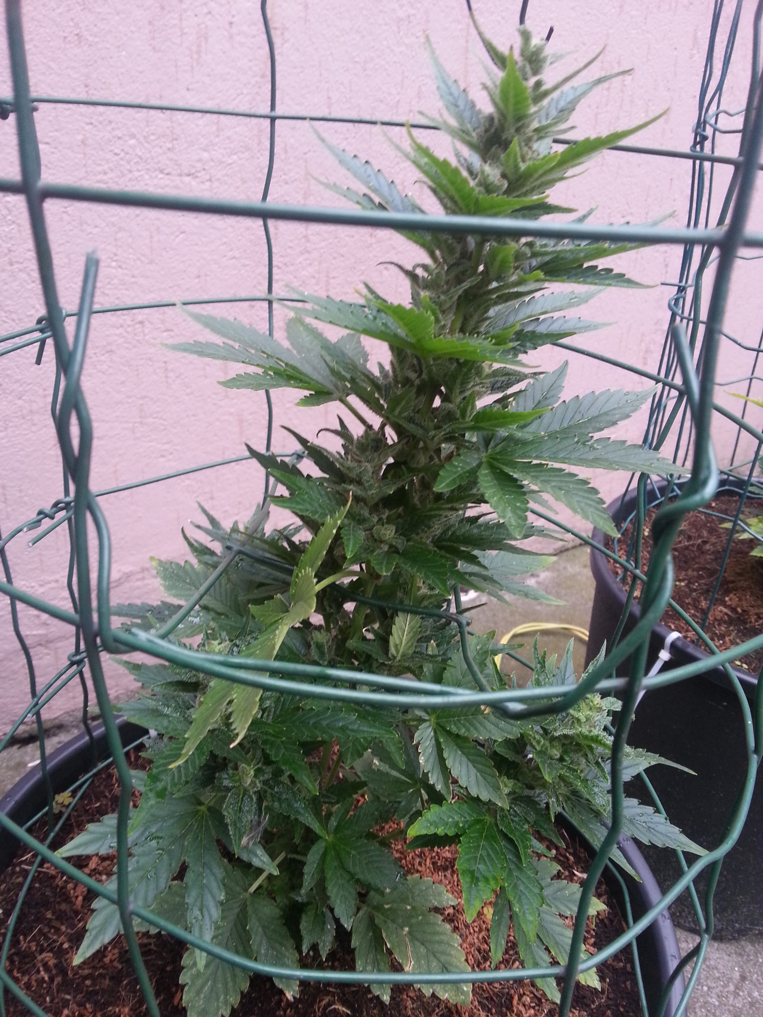 Wat een verschil hè. Deze twee planten zijn van 20 centimeter hoge meisjes, uitgegroeid tot ware diva’s met een oppervlakte van ruim drie vierkante meter! De bloei zit er nu ook goed in, ik zie zelfs al trichomen in de toppen ontstaan. Als het weer een beetje meewerkt denk ik dat ik een hoop wiet van deze twee dames kan oogsten straks.