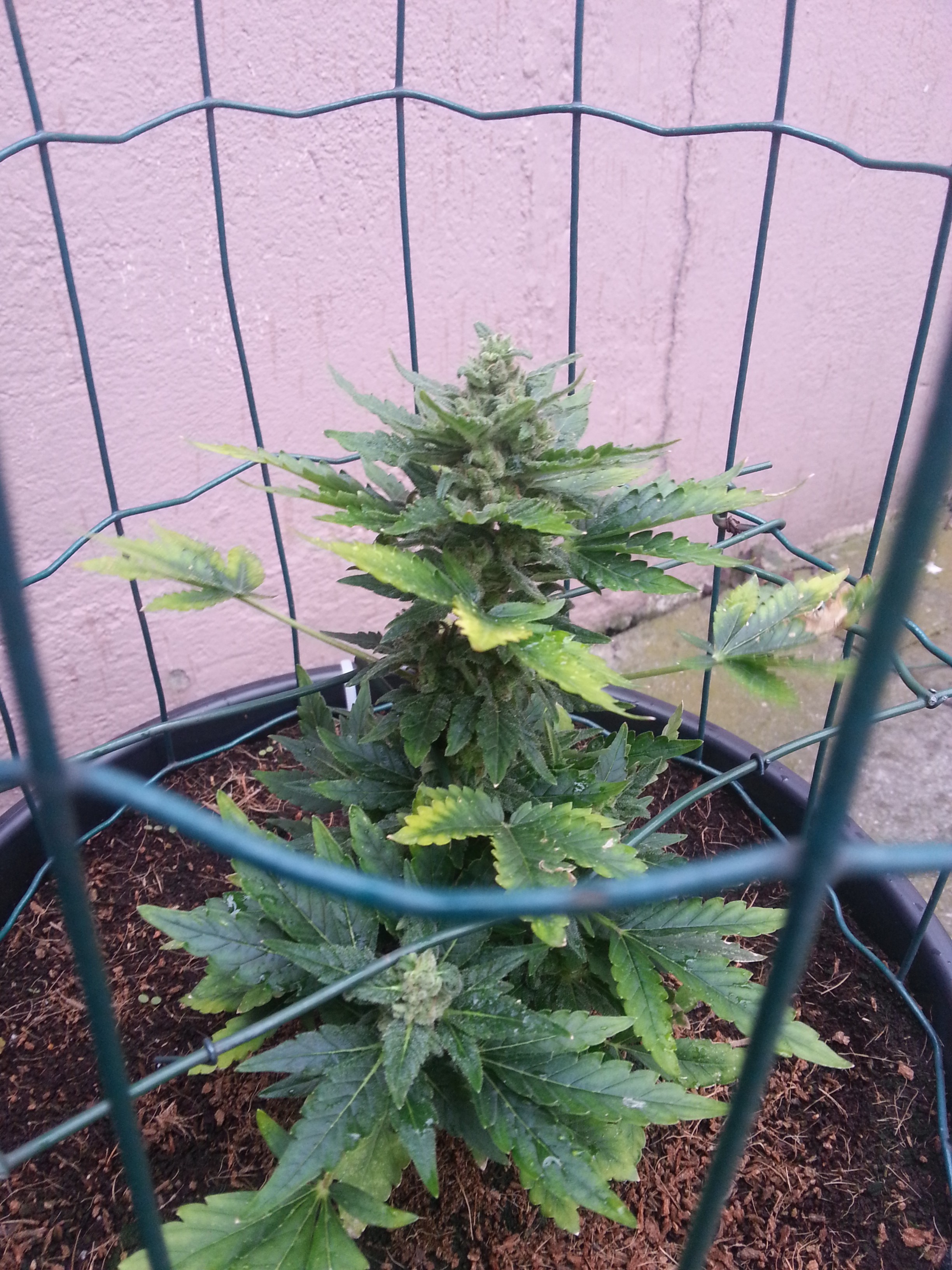 Over de Early Skunk kan ik helaas nog niet veel goed nieuws vertellen, ze bloeit nog altijd niet, en heeft ook behoorlijk last van de regen gehad. De dame staat pas sinds een paar weken in de volle grond en deed het ook al niet goed in de pot waar ze daarvoor instond. Ze had niet voor niets een knobbel onderaan haar stam. Een knobbel zoals dat is eigenlijk een soort omleiding die de plant maakt omdat de sapstroom er anders niet goed doorheen kan. Ik had, toen ik dat voor het eerst opmerkte al voorspeld dat deze dame het niet heel goed zou doen, maar ik kreeg weer goede hoop toen ik zag dat ze wat opleefde in de volle grond. We wachten het af, want ik heb de Early Skunk zeker nog niet afgeschreven.