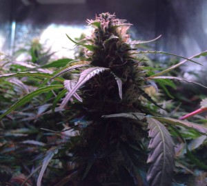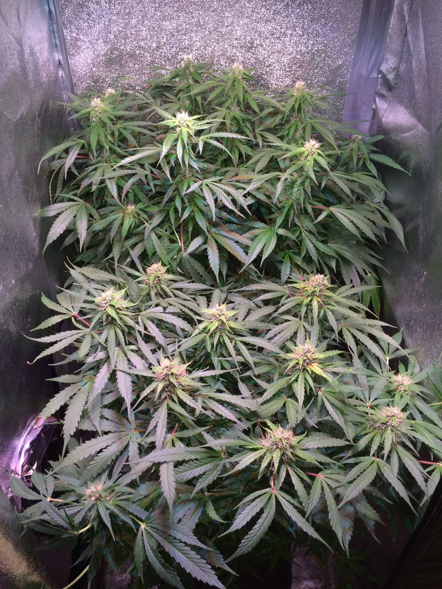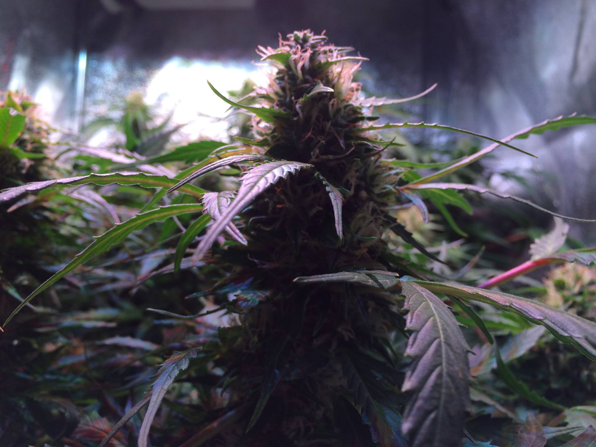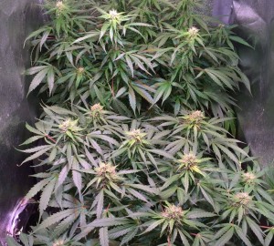 Ook kan ik melden dat het stuifmeel van een mannelijke bloem die ik een paar weken geleden op de voorste plant vond, op een top van de achterste plant heb gesmeerd. En nu kan ik dus melden dat de bevruchting gelukt is. In de top groeien een aantal mooie grote zaden! De voorste plant is al lekker aan mooie volle toppen aan het werken. Het zijn langgerekte sativa toppen.