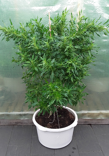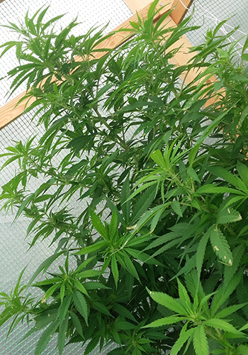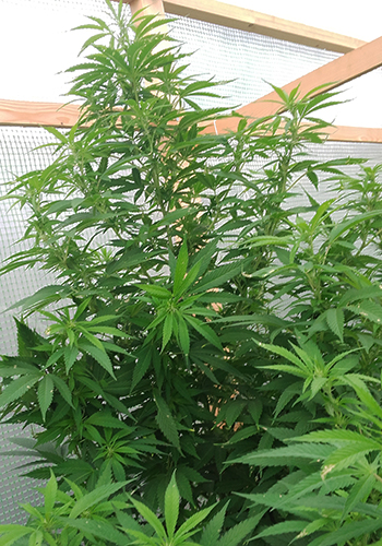 Met nog een aantal weken goed weer achter de rug en voor de boeg, zijn wij op dit moment blij met onze keuze. We hebben niet verduisterd. Hadden we dat wel gedaan dan waren de planten nu misschien al afgebloeid. Dat zou mooi zijn, maar dan waren de toppen waarschijnlijk niet zo aangedikt. We hebben nu rustig de tijd om eventueel naar een extra verlichtingsbron te zoeken. D planten hebben daarnaast de tijd gehad om te herstellen na al het gebind, gefim en getop. Onze inzet loont zich behoorlijk, zoals we schatten hebben we daardoor per plant ongeveer 30 tot 40 procent meer opbrengst. Er is tot aan de bloei veel afgebonden in de kas en het is dan ook ontzettend moeilijk om door het dichte bladerdek een foto te maken waarbij de planten er in hun geheel opstaan. Er moest veel blad van de dames ontdaan worden om ze tijdig voor te bereiden op hun laatste 5 tot 9 weken.