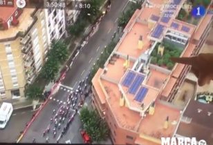 Met nog een kilometertje te gaan draaide de finish uit op een sprint tussen de koplopers, maar ondertussen liet de Spaanse tv nog even wat beelden zien vanuit de helikopter van het peloton, dat op meer dan negen minuten van winnaar Arndt kachelde. En daar ging het dus gruwelijk mis.