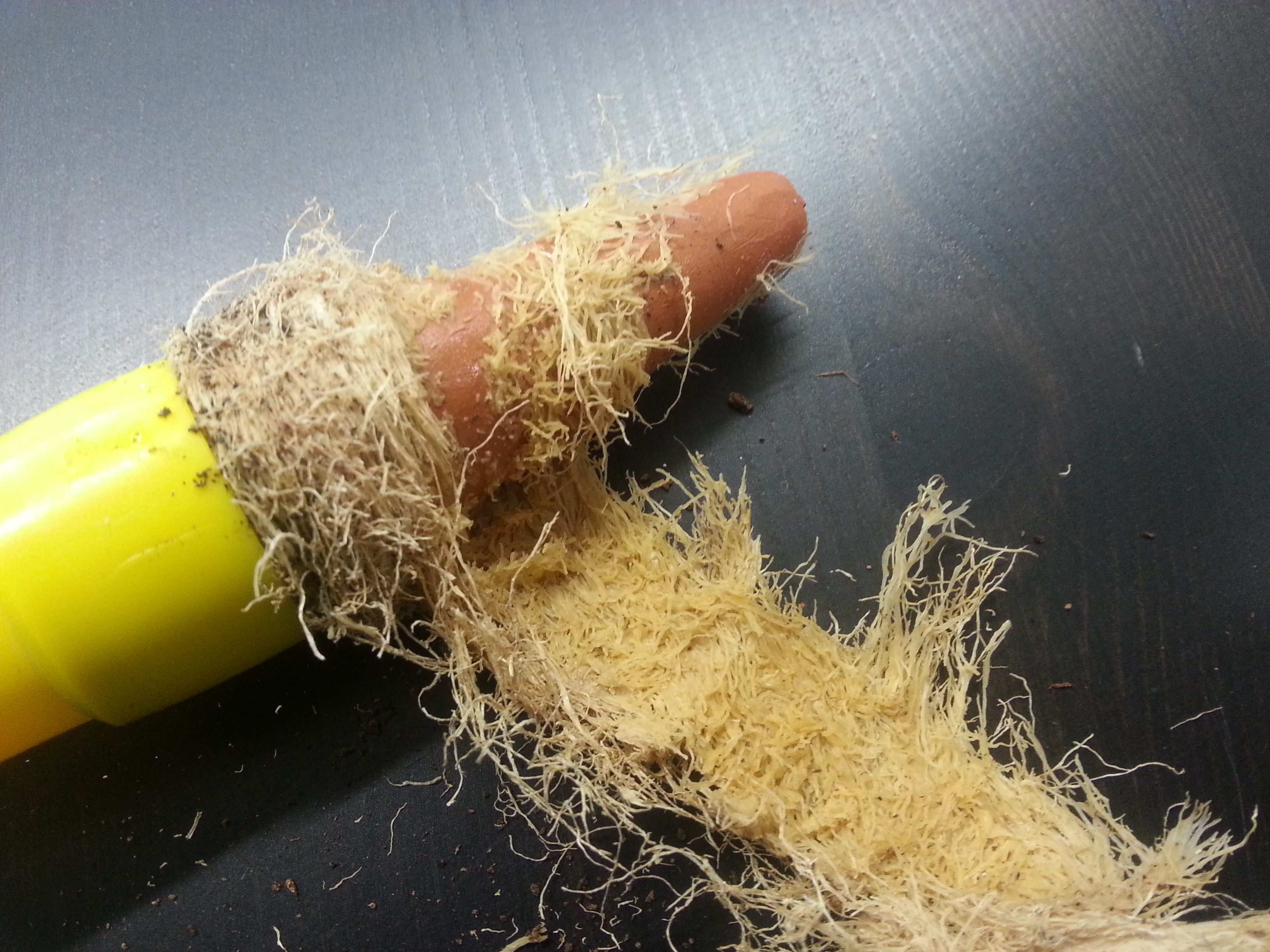 Links de met wortels begroeide kleisensor die de kluit gedurende het grootste deel van de cyclus nat heeft gehouden en rechts de uitgedroogde kluit met aarde uit de smart pot