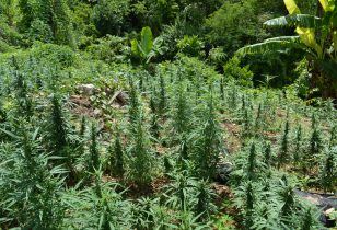 Jack Ruby avenue in Ocho Rios. De ganja plant onder het stopbord vertelt je dat je op het juiste adres bent. Goede wiet kost hier slechts 70 eurocent per gram.