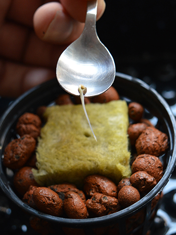 Als de netpotjes klaar staan prik ik een gaatje met een satéstokje in het midden van de stekblokjes. Dan neem ik de zaadjes één voor één met een theelepeltje op, en laat ik ze met het worteltje in het gaatje zakken. Ik doe dan nog een klein laagje voedingswater in de bodem van mijn propagator (wordt ook meegeleverd met de Dokter Groen Special) en de deksel erop, en die zet ik dan in de kweekkast.