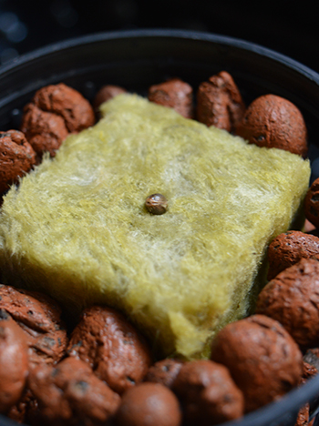 Vul de netpotjes vervolgens eerst met zo’n 2 centimeter kleikorrels en plaats dan pas het steenwolblokje erop. Ik doe het zo, dat de bovenkant van het steenwolblokje gelijk is met de bovenkant van het netpotje. Waarom zeg ik dit nou? Nou, wanneer het stekblokje onderin het netpotje zit, dan spettert het nat in het systeem, waardoor je stam onderaan de plant kan gaan rotten. Op deze manier heb je daar geen last van.