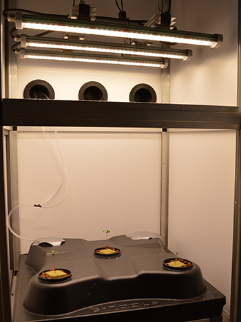 Het licht in de kast zet ik vanaf dat moment ook meteen aan (op 18/6 uiteraard). Alle drie de LED balken van de G-Bars laat ik branden maar de lamp hangt wel wat hoger in het begin. En zo had ik vanmorgen drie gezonde zaailingen, waar bij ééntje zelfs al een worteltje onder uit het netpotje groeide.