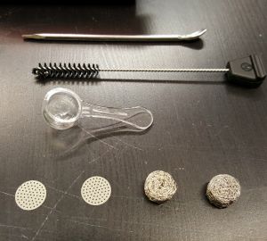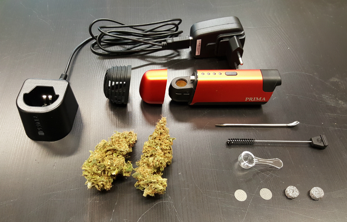 Eronder bevinden zich alle benodigde accessoires die Vapir bij de Prima levert: een oplader met adapter (inclusief extra stekkeradapter voor Amerikaanse stopcontacten) voor de accu, twee extra gaasjes voor wiet en twee extra gaasjes voor concentraten, een rubberen dop tegen de hitte, een plastic schepje om de verdamper mee te vullen, een mooie roestvrij stalen poker en een borsteltje om het luchtkanaal van de Prima mee te reinigen. De wiet zat helaas niet in de verpakking 😉
