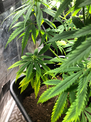 Dans eerste wietplanten krijgen om de dag bloeivoeding maar beginnen ondertussen dus wel te vergelen. Vanaf de bladpunten en randen van de onderste bladeren naar het midden en boven toe. De dames hebben zo te zien ook al een paar toppen, zijn best wel lang geworden en laten hun bladeren wat omlaag krullen. Moet hij zich zorgen maken om zijn eerste oogst, of valt het allemaal wel mee?