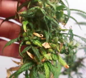 Een voor een heb ik de planten uit de kast genomen en met de hand kaalgeplukt. De CBD Kush planten stonden vooraan en daarvan ging de oogst vrij gemakkelijk. Na het plukken heb ik ze ondersteboven terug in de kast gehangen om te laten drogen. De Compassion planten had ik al een beetje opgegeven, aangezien deze toppen niet goed wilden groeien. Ze bleven maar luchtig en wilden niet goed hard worden. Ik dacht aanvankelijk dat dat een reactie op het LED kweeklicht was maar ben er nu achter waar dat werkelijk aan heeft gelegen. Tenminste een van de twee Compassions was een hermafrodiet!
