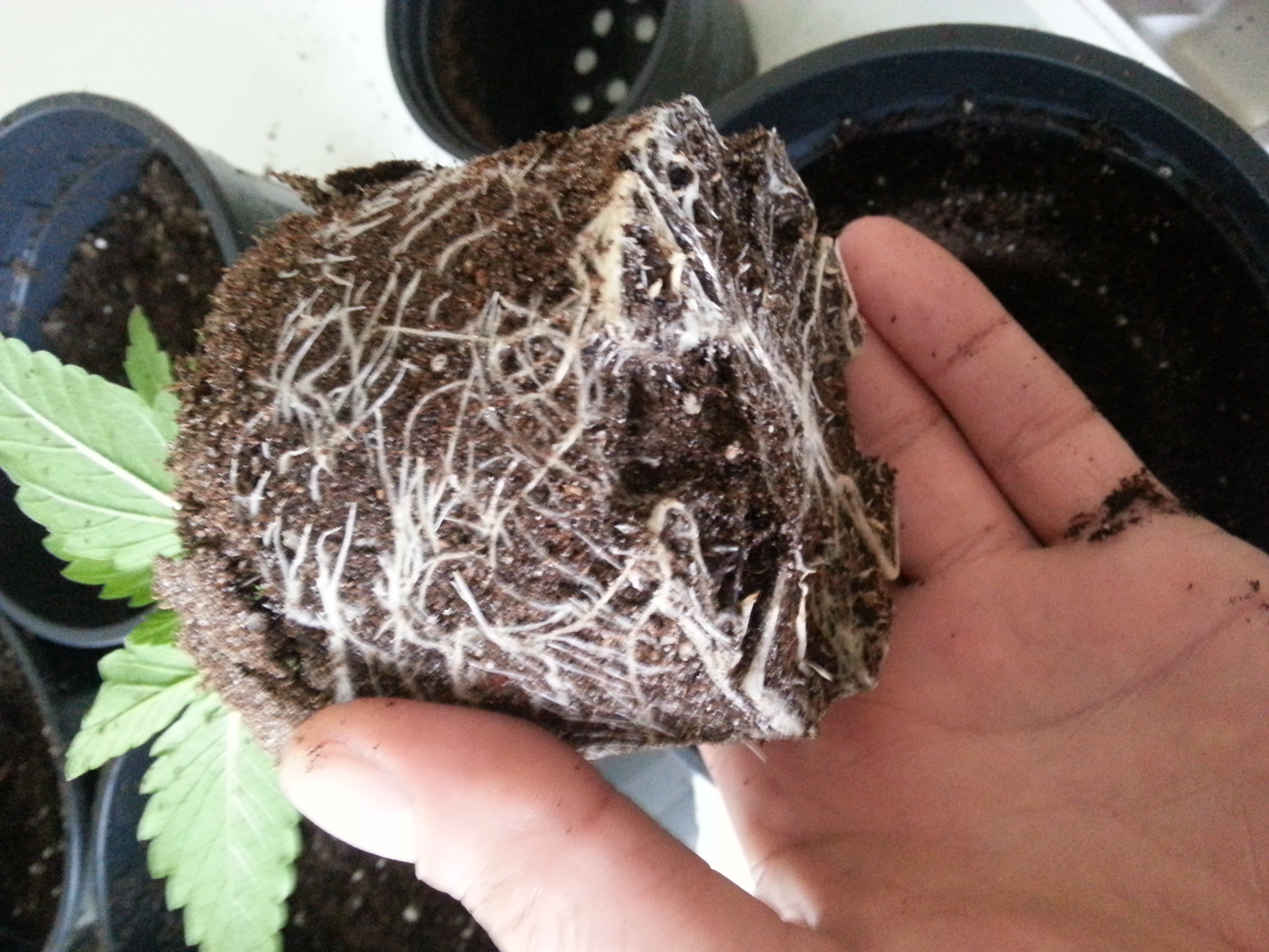 Verpotten is eigenlijk een vorm van training voor je wortels. In iedere pot ontwikkelt de plant een mooie worteldichtheid en als je op tijd verpot hebben de wortels steeds genoeg ruimte om verder te groeien in een nieuwe pot. Uiteindelijk heeft je wietplant een mooie grote pot die van binnen en aan de buitenkant vol zit met gezonde wortels.