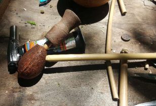 Je begint met het doorprikken of boren van twee van de drie gaten in de kokosnoot. Vervolgens haal je met een schroevendraaier via de gaten, het witte vruchtvlees uit de noot. Een tijdrovend klusje en op zich al behoorlijk meditatief om te doen. Als de kokosnoot schoon is, begin je met het op maat maken van het stuk bamboe dat de bowl met het water in de kokosnoot verbindt. Meet met een dun stokje of je schroevendraaier eerst even tot hoe diep de bamboestok zal gaan en tel hier ongeveer een centimeter of drie bij op. Neem een bamboestokje en zaag die op deze lengte af. Met een mes maak je hem vervolgens dun genoeg en laat je hem taps aflopen zodat hij stevig in de kokosnoot klemt.