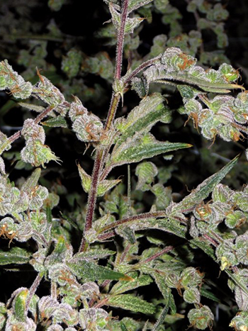 Van de drie toppen hierboven zijn de bovenste twee genetisch van aanleg. Op de tweede foto (rechtsboven) zie je de bijzondere wietsoort (Dr. Grinspoon van Barney’s Farm) met een extreme aanleg voor de opgestapelde calyxen. De bloemen van deze soort bestaan soms zelfs alleen maar uit losse calyxen. De onderste top is echter door lichtstress zo geworden. De uiterste punten zijn zelfs spierwit door een te veel aan licht.