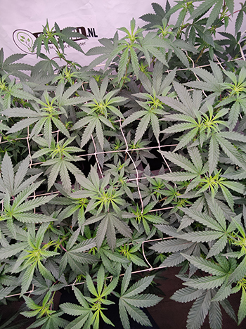 Na het verpotten hebben we de dames een goede 2 weken laten groeien, gescrogd en ontbladerd. Normaliter gebruiken we het scrognet alleen voor ondersteuning en een beetje sturing van de takken. Deze keer hebben we er echter iets meer werk aan besteed, waardoor we nu een heel mooi gevulde tent hebben. En dat ziet er geweldig uit al zeg ik het zelf!