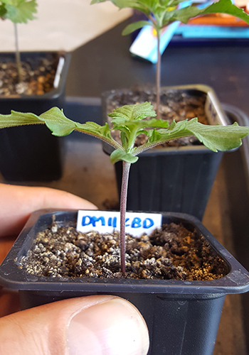 De vier zaailingen bij elkaar, linksvoor en rechtsachter de Atomical Haze, je kunt zien dat ze wat hoger zijn dan de Durga Mata II CBD’s.