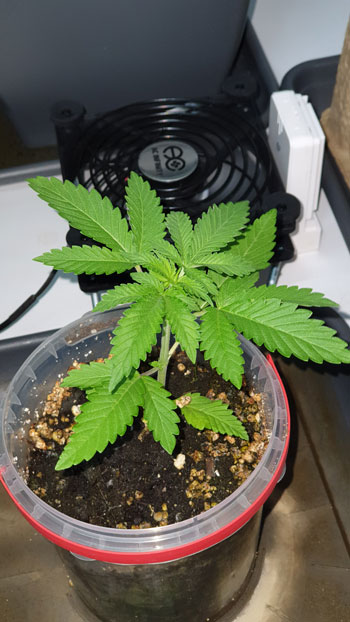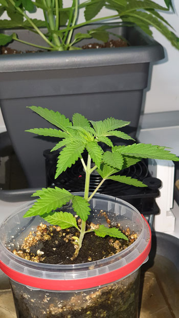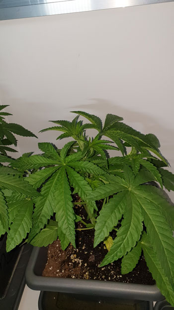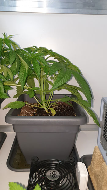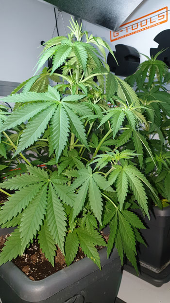 De AK Choco Kush (eveneens van Amsterdam Genetics) is met 23 centimeter goed op weg. Het wordt al een aardig struikje en kan binnenkort een ook een diefbeurt verwachten. Terwijl het nog niet zo’n groot plantje is zitten er wel mooie grote schutbladeren aan. De stam heeft een licht knikje. Dat is gekomen door een ongelukje met een camera die omviel. Oeps! 🙂