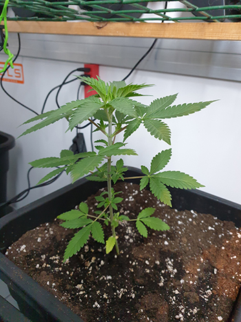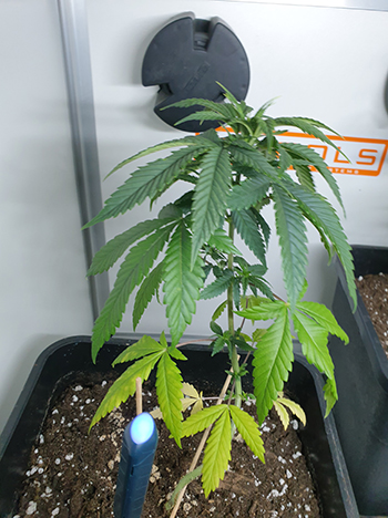 Als we de dames van wat dichterbij bekijken zien we dat het bovenste deel veel meer bladeren vormt en kortere internodes. Ook dat is een reactie op het wisselen van de lichtbron. De dames hebben een gemiddelde hoogte van 34 centimeter en dus is het al bijna tijd om ook hier het hekwerk te plaatsen. De dames hebben de hoogte bijna bereikt. De G-Bars hangt op een hoogte van 18 centimeter boven de dames. De bewatering van de dames gebeurt dagelijks en ze krijgen dan 250 milliliter water met voeding.