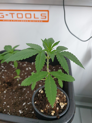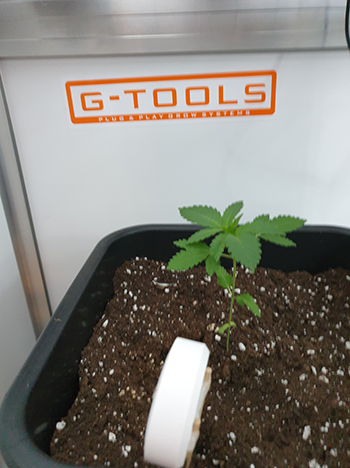 Dan de linkerzijde in de G-Kit XL; hier staan de twee jongste Sneeze plantjes. Eén van de dames is al verpot en de andere staat ernaast. Dit heb ik natuurlijk niet gedaan voor de gezelligheid maar om de dames op gelijke hoogte te houden zodat ze evenveel licht krijgen. Deze twee dames hebben een gemiddelde hoogte van 14 centimeter. De planten staan al een aantal dagen in hun pot, en ondanks de verschillende potten zijn de plantjes ongeveer even groot, dus dat gaat voor nu nog goed.