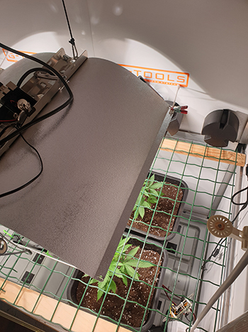 De twee Sneeze dames aan de rechterkant van de grote kweekkast hebben een gemiddelde hoogte van 29 centimeter. Zoals je kunt zien op de foto’s heb ik het hekwerk nog niet verhoogd tot boven de luchtinlaat. Dit heb ik expres nog niet gedaan. Als ik het hekwerk namelijk verhoog dan moet de lamp ook meteen zo’n 20 centimeter verder omhoog. Dan zou ik de plantenpotten weer op verhogingen neer moeten zetten om een afstand tot het rek van maximaal 30 centimeters boven de planten aan te houden.