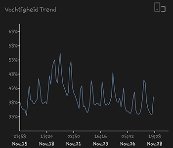 De gemiddelde luchtvochtigheid was de afgelopen 14 dagen 46,46 procent. Ook hier was een piek te zien rond dezelfde tijd dat ik de ramen deed, en ook dat was te verklaren want ik heb toen de kamer gedweild. De 315 Watt CMH binnenzon hangt op een hoogte van 28 centimeter boven de hoge planten. Het licht is 18 uur aan en 6 uur uit (18/6 lichtschema). De twee grote Sneeze planten krijgen per dag 350 milliliter water met voeding van Plagron. De twee kleintjes krijgen 50 en 30 milliliter water met voeding.