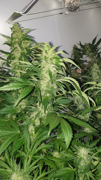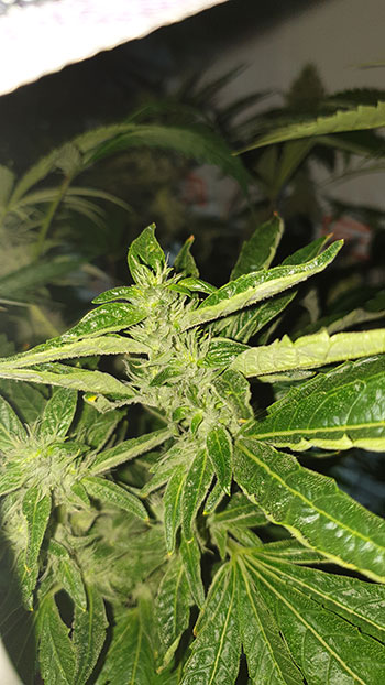 Bij de Morning Glory’s staat het al aardig vol en zijn ze volledig transparant. Dit betekent dat de trichomen goed in ontwikkeling zijn maar nog niet rijp genoeg zijn om te oogsten. De Critical Orange Punch zit ook al goed vol. De trichomen lijken hier wit te zijn maar dat is de weerkaatsing van een lamp in de kamer. Nog niet helemaal rijp dus. Bij de AK Choco Kush is het blad een stuk minder goed bedekt. Deze plant is ook wat later in bloei gegaan. Voor de White Choco Haze geldt hetzelfde als voor de AK Choco Kush: de dames zijn weekje jonger en minder bedekt met trichomen.