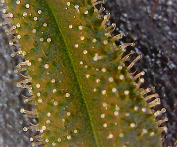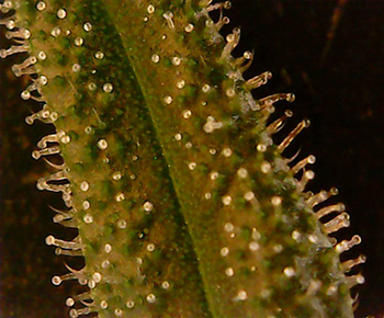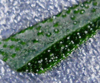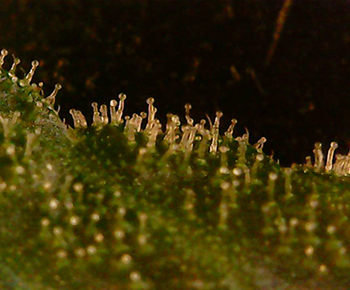 Ik heb de microscoop erbij gepakt om de trichomen eens te bekijken. De trichomen, of harskliertjes zijn een goede indicatie voor de rijpheid van wiettoppen. Het is een beetje veel om hier uit te leggen maar in dit artikel lees je precies hoe het zit. Bij elke plant heb ik uit de hoofdtop een suikerblaadje weggeknipt om onder de microscoop te leggen.