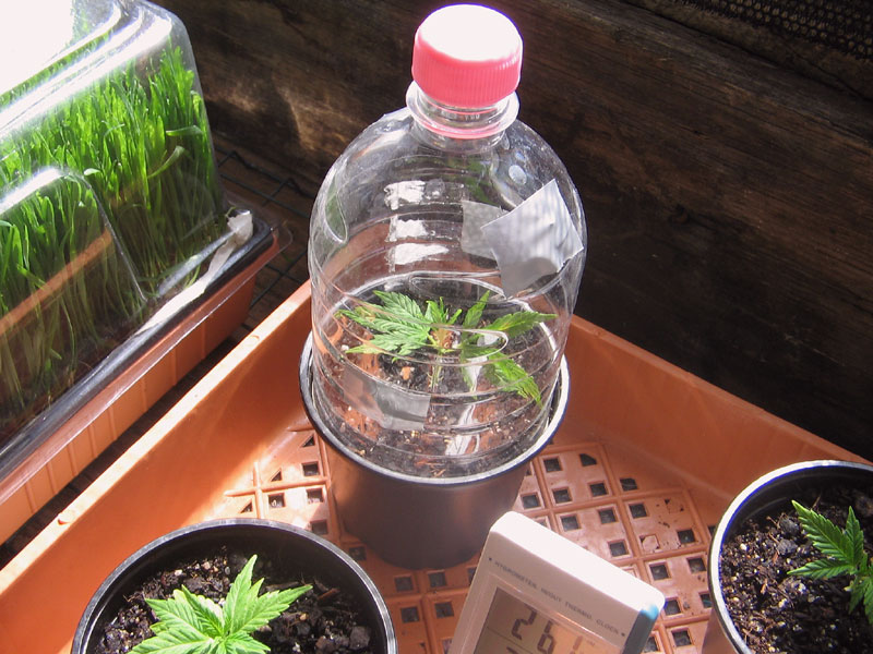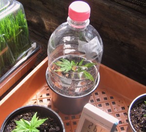 Een halve plastic fles kan de zaailing buiten beschermen tegen kou, insecten, slakken en knaagdieren. Maak een paar gaatjes in de zijkant van de fles voor de nodige frisse lucht. Hoewel zaailingen bijzonder goed tegen kou kunnen, moet je weten dat nachtvorst een zaailing kan doen bevriezen en daarmee een vroegtijdig einde kan maken aan het leven van je wietplant. De plastic fles beschermt tegen de kou, maar als je weet dat er nachtvorst op komst is kun je je zaailingen nog beter even naar binnen halen.